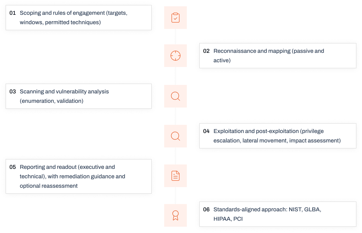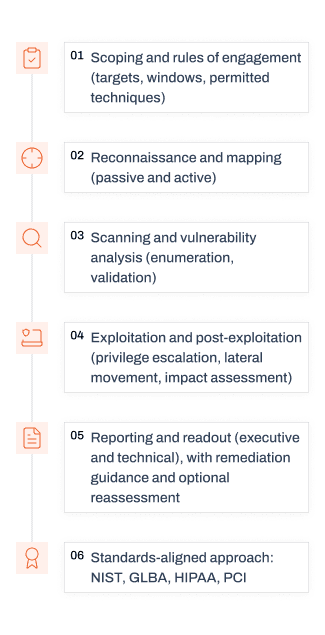 Aligned to industry standards (NIST, GLBA, HIPAA, PCI) and real-world attack techniques (black-box, white-box, gray-box)